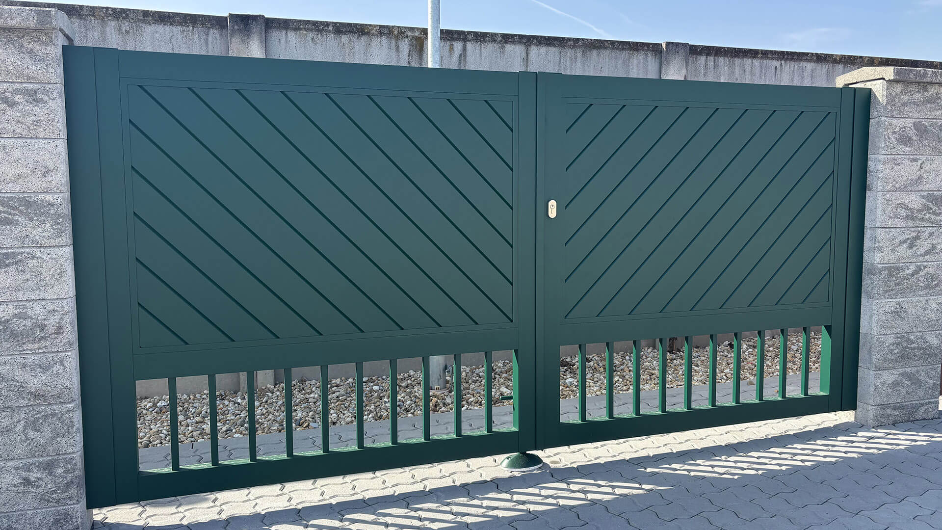 ist ein zeitloses Zaunsystem, das sich durch seinen Charakter natürlich in klassische, ländliche und rustikale Architektur einfügt. Die Füllung besteht aus Nut- und Federprofilen, die passgenau ineinandergreifen und eine kompakte, stabile und optisch geschlossene Fläche bilden. Das Modell DAVOS ist in zwei Ausführungen erhältlich – Füllung im Rahmen oder Füllung auf dem Rahmen. Bei der Variante „im Rahmen“ kann eine diagonale Anordnung der Profile gewählt werden, die an traditionelle Holztore und -zäune erinnert, alternativ auch eine Kombination aus Diagonale mit vertikaler oder horizontaler Gliederung. DAVOS vereint das Aussehen eines klassischen Zauns mit den Vorteilen modernen Aluminiums. Es ist die ideale Wahl für Einfamilienhäuser mit traditionellem Charakter, Landhäuser oder renovierte Objekte.