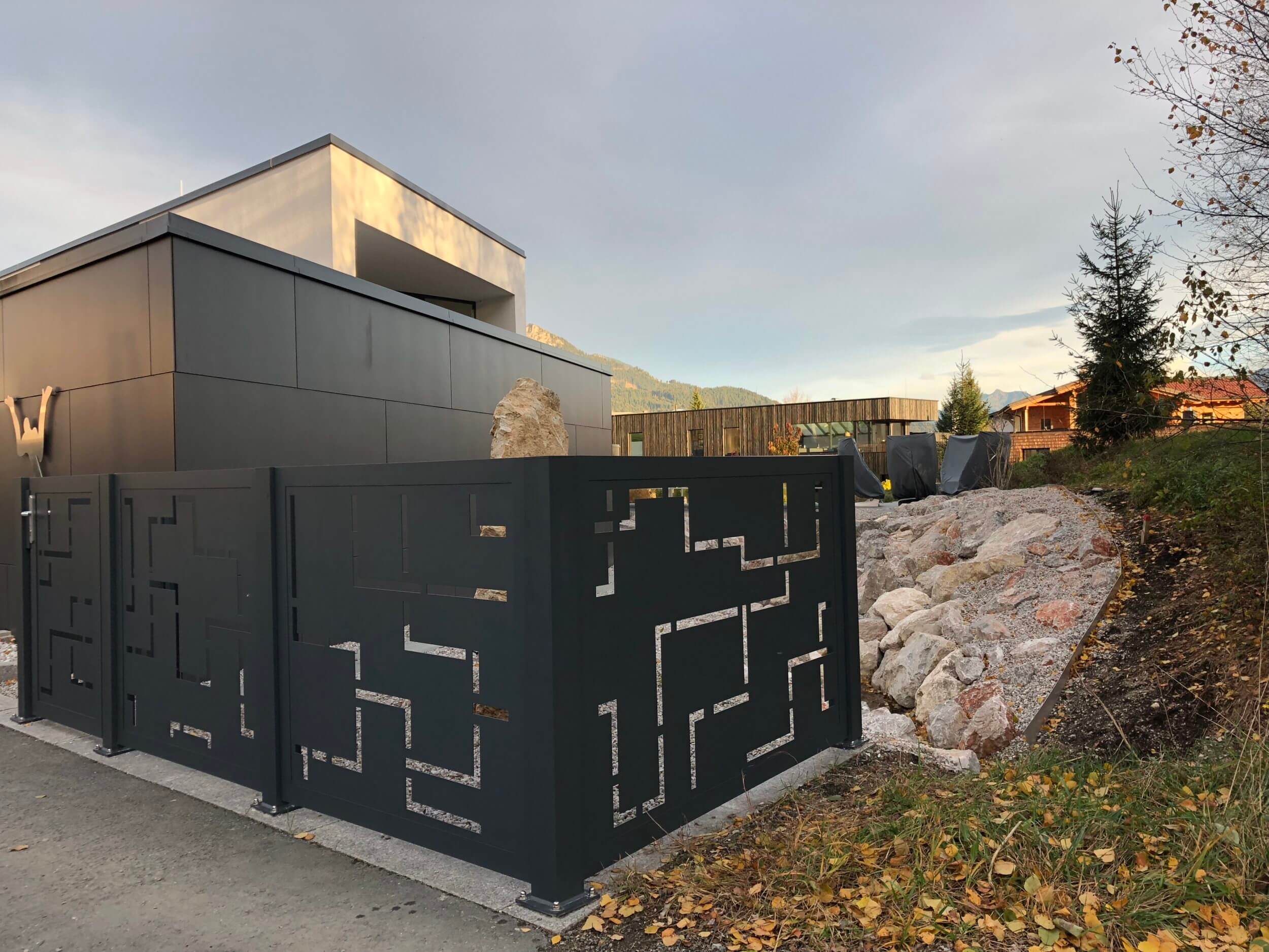 Dieser Designzaun aus gelasertem Aluminiumblech vereint moderne Architektur, präzise Verarbeitung und zeitloses Erscheinungsbild. Der Zaun wird standardmäßig aus 2 mm starkem Blech hergestellt, das mit einem Laser in ein originelles geometrisches Muster geschnitten wird. Für alle, die zusätzliche Stabilität wünschen, bieten wir auch eine 3–4 mm Blechversion an – der Preis ist natürlich höher. Dadurch wirkt der Zaun massiv, gleichzeitig jedoch optisch leicht und elegant. Die Oberflächenbehandlung sorgt für hohe Witterungsbeständigkeit und lange Lebensdauer bei minimalem Wartungsaufwand. Ideal für moderne Einfamilienhäuser, Villen oder architektonisch markante Objekte.