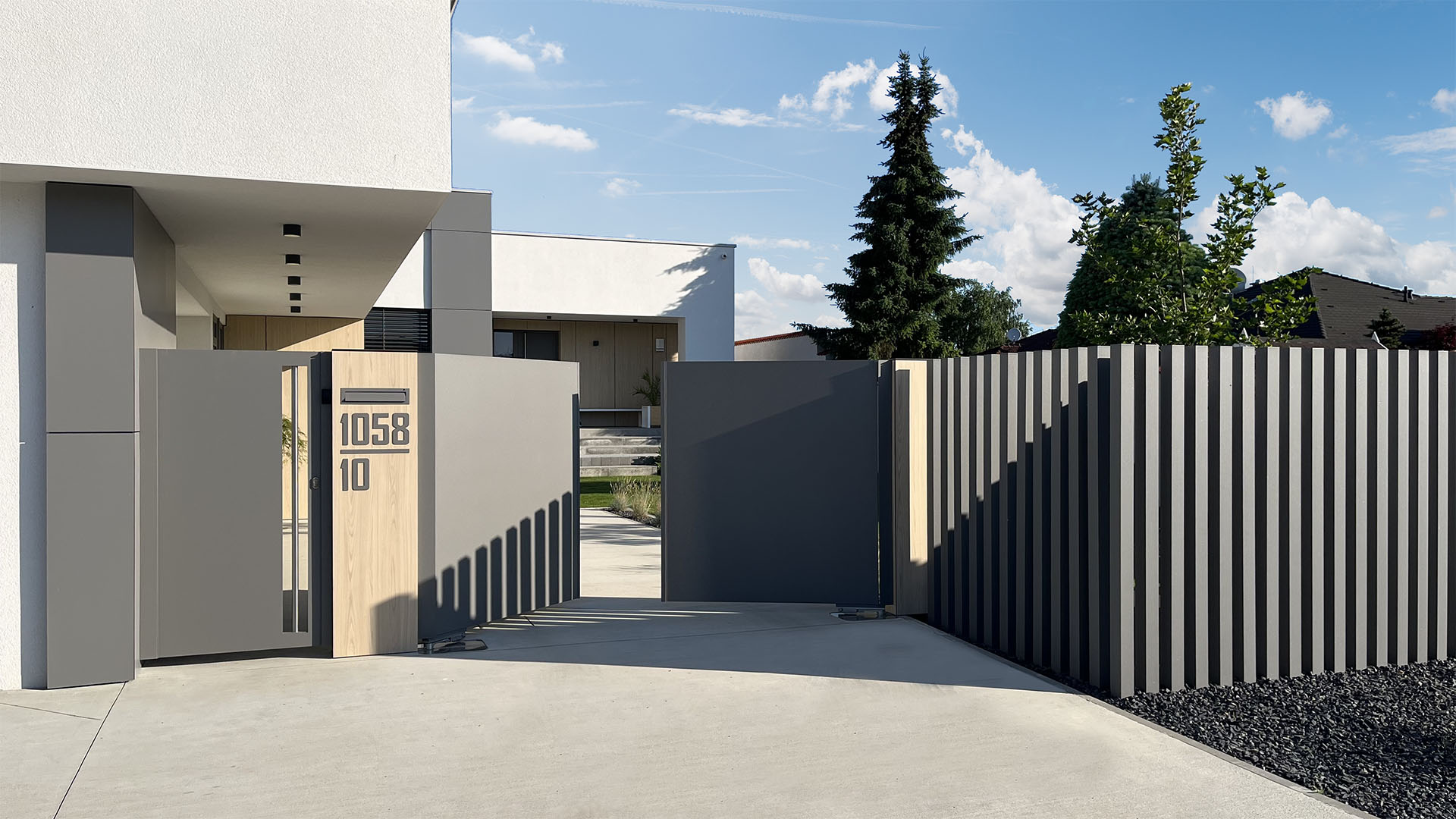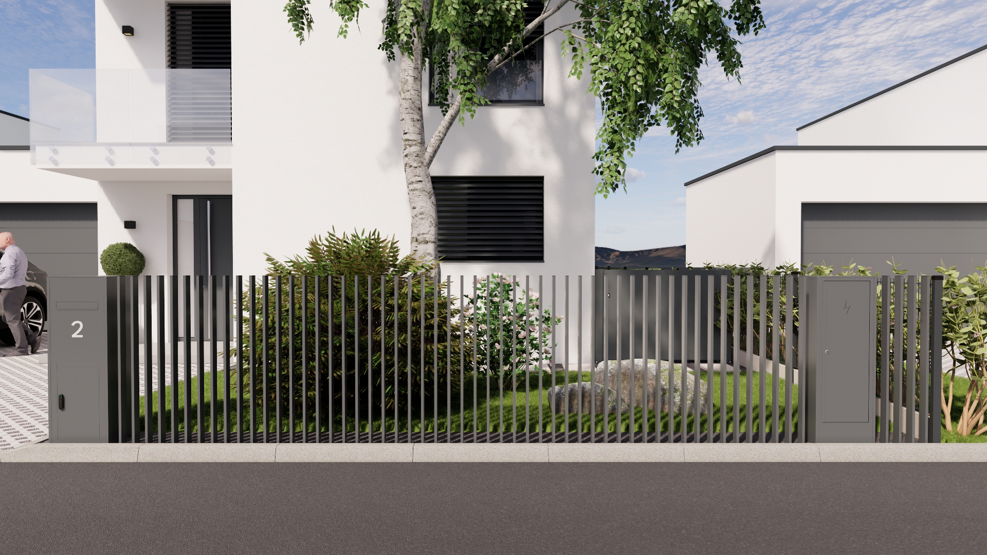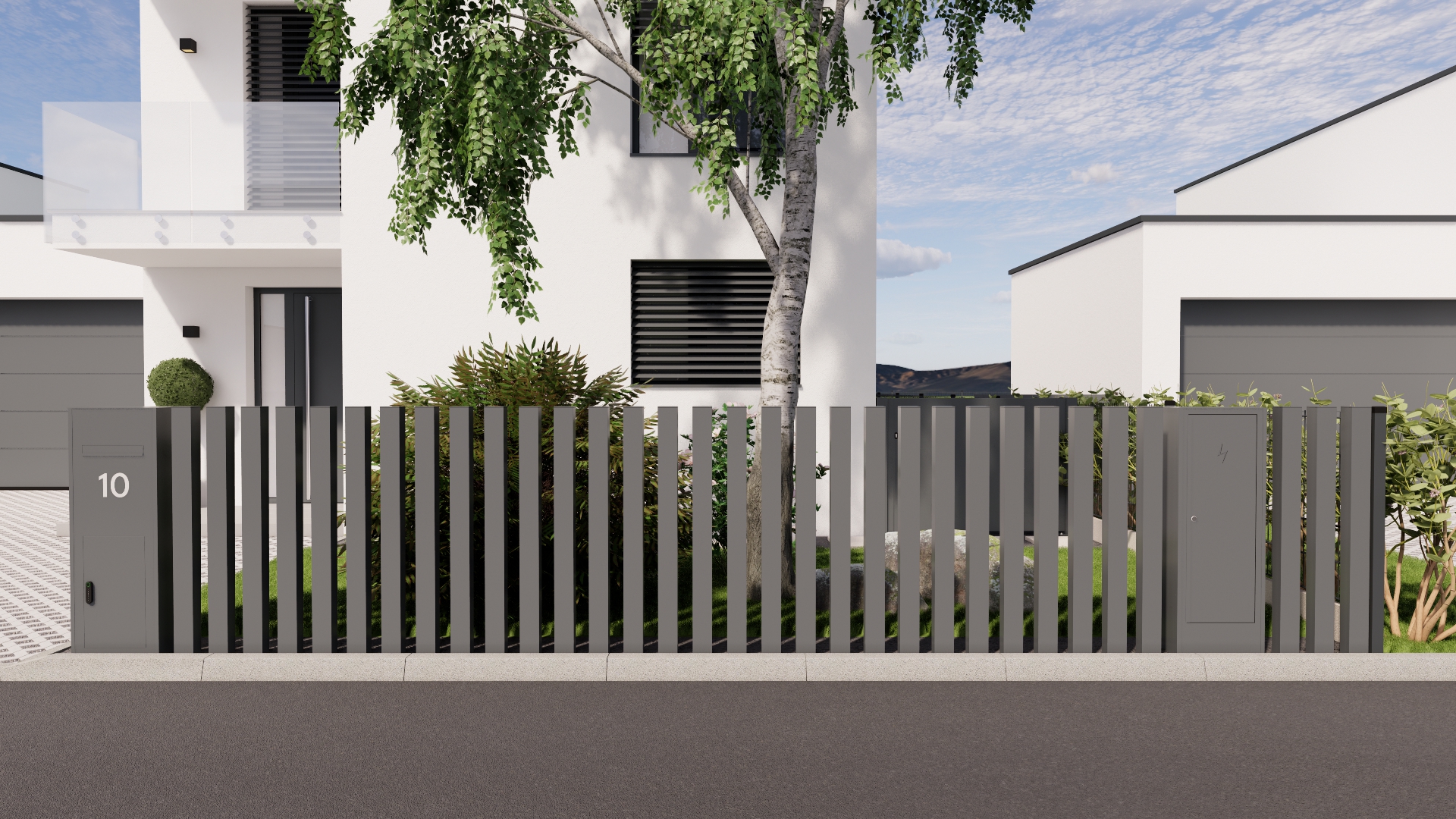 Das Zaunsystem SPLIT ist designmäßig auf unser Modell NEAPOL abgestimmt und ergänzt es perfekt. Gemeinsam schaffen sie ein einheitliches und harmonisches Außenbild, in dem Funktionalität mit architektonischer Eleganz kombiniert wird. Diese Kombination ist die ideale Wahl für Kunden, die Wert auf Details und visuelle Kontinuität des gesamten Zauns legen. Ebenso besteht die Möglichkeit eines integrierten Briefkastenpfostens und einer freistehenden Abdeckung für Versorgungseinrichtungen, designmäßig auf den Zaun abgestimmt.