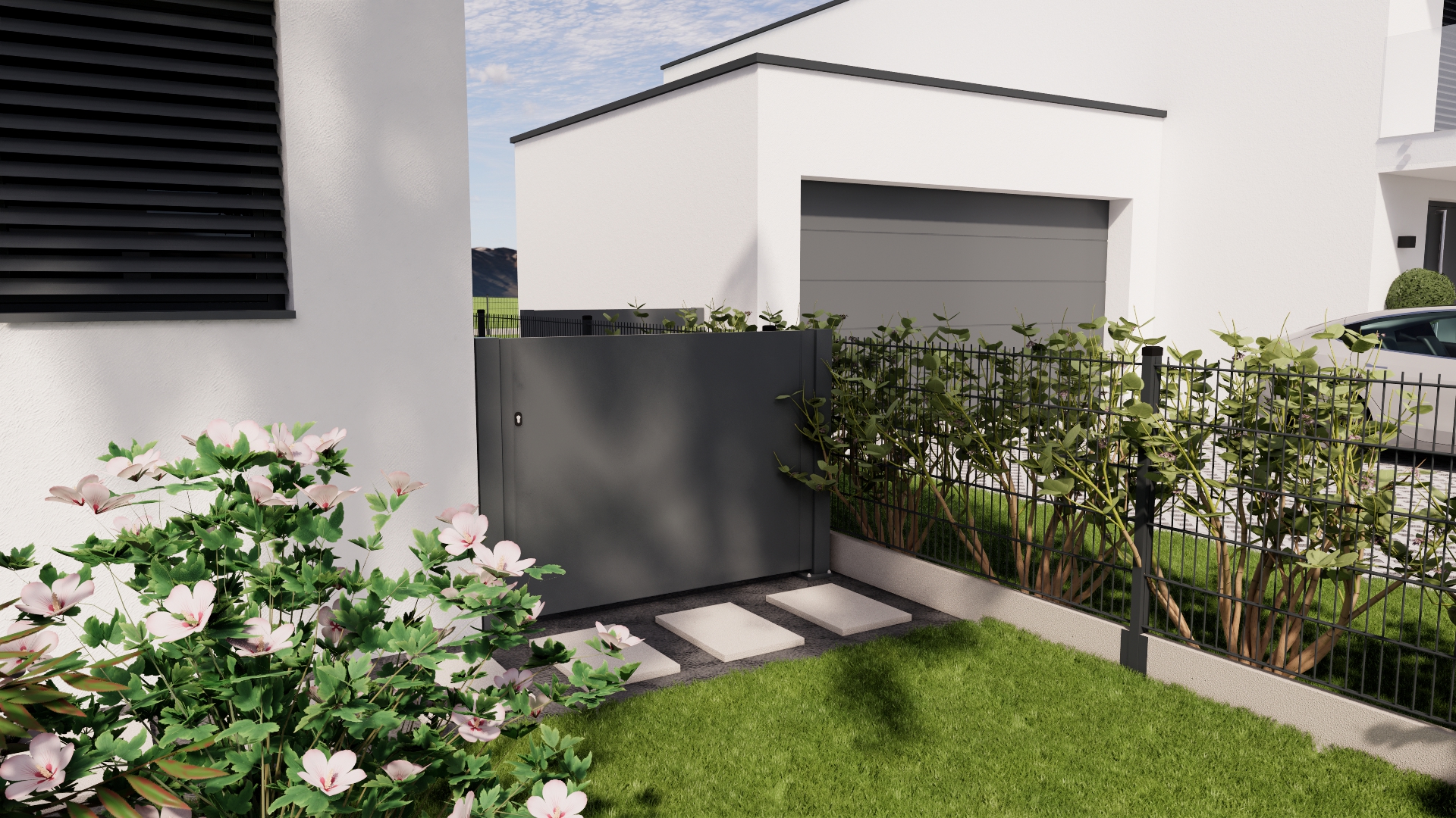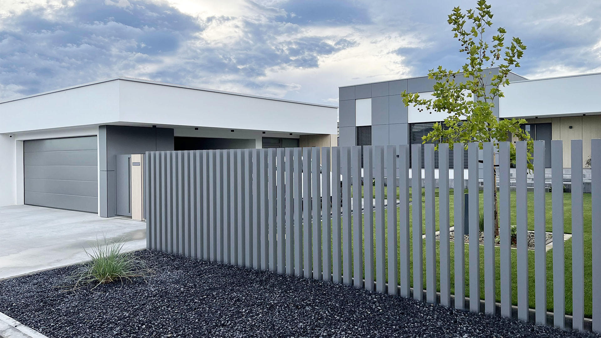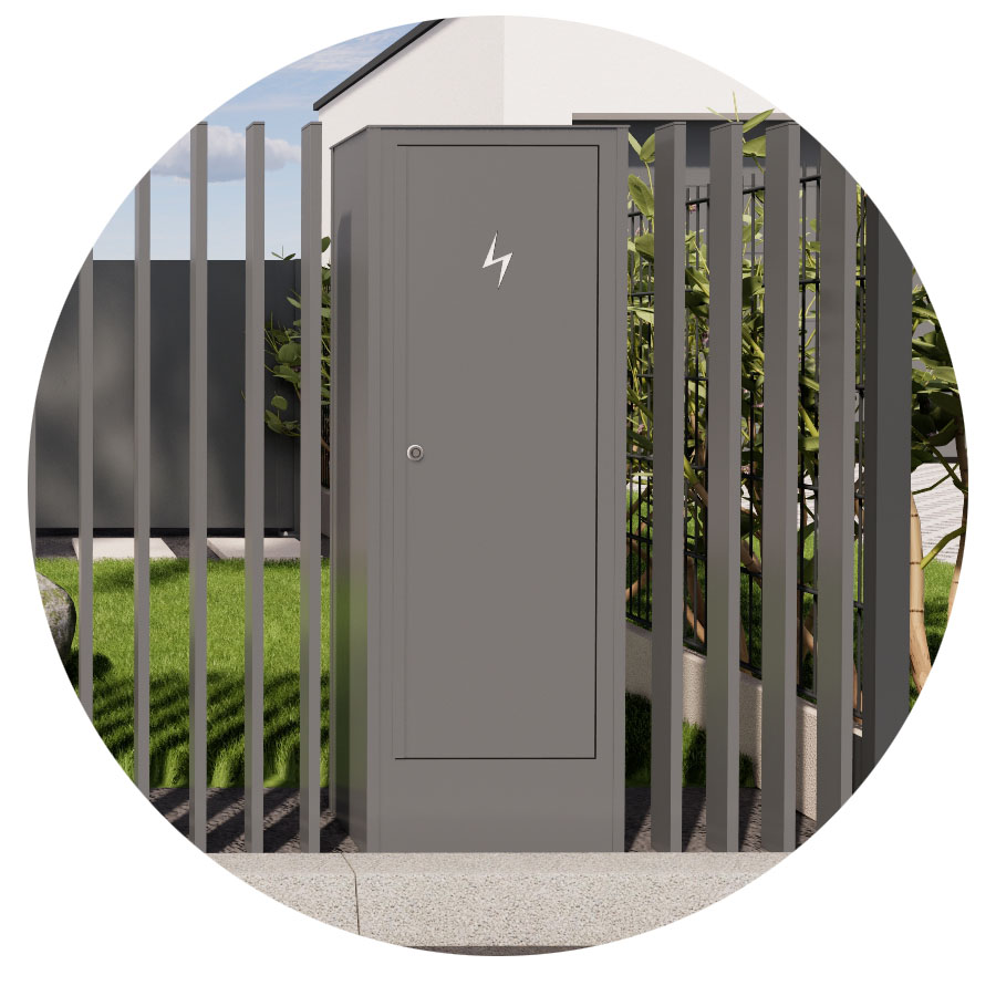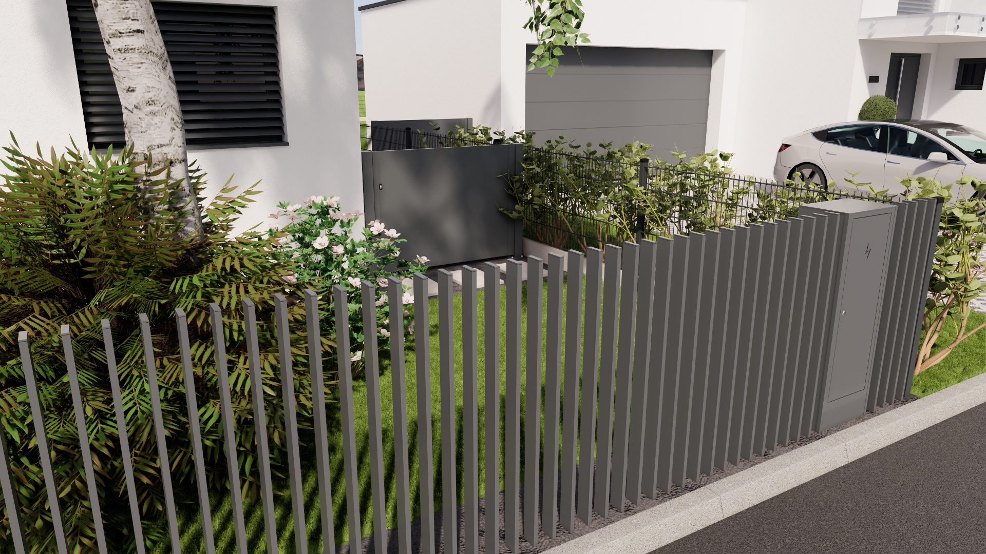 Das Zaunsystem SPLIT ist designmäßig auf unser Modell NEAPOL abgestimmt und ergänzt es perfekt. Gemeinsam schaffen sie ein einheitliches und harmonisches Außenbild, in dem Funktionalität mit architektonischer Eleganz kombiniert wird. Diese Kombination ist die ideale Wahl für Kunden, die Wert auf Details und visuelle Kontinuität des gesamten Zauns legen. Ebenso besteht die Möglichkeit eines integrierten Briefkastenpfostens und einer freistehenden Abdeckung für Versorgungseinrichtungen, designmäßig auf den Zaun abgestimmt.